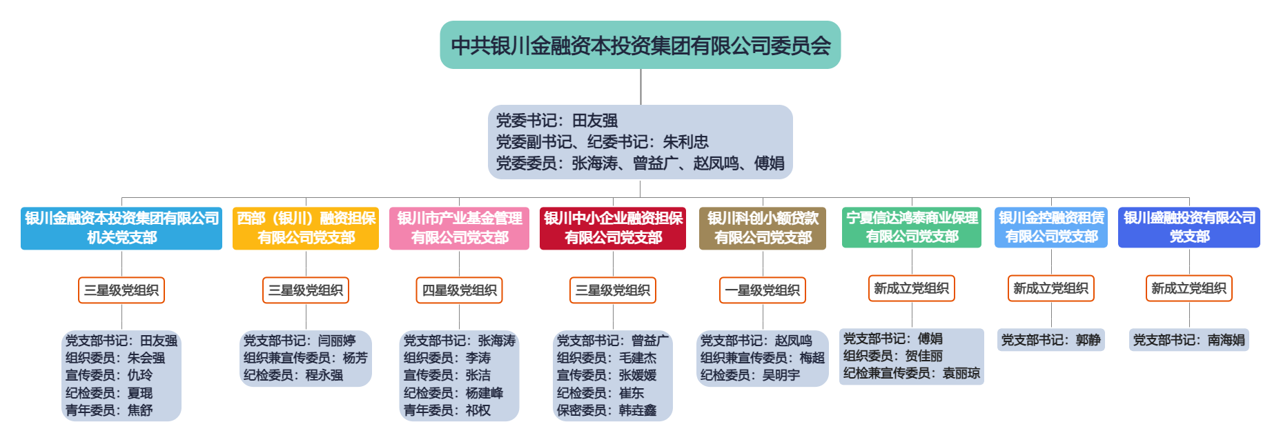 銀川金融資本投資集團(tuán)有限公司黨委于2019年12月6日成立,在銀川市委、市政府及市國(guó)資金融黨工委的領(lǐng)導(dǎo)下,堅(jiān)持以習(xí)近平新時(shí)代中國(guó)特色社會(huì)主義思想為指導(dǎo),堅(jiān)持正確的政治方向,宣傳貫徹落實(shí)黨的路線方針政策,嚴(yán)格按照上級(jí)有關(guān)部署開展各項(xiàng)工作,有效發(fā)揮黨建在企業(yè)經(jīng)營(yíng)管理中管大局、把方向的政治引領(lǐng)作用。集團(tuán)黨委目前設(shè)立7個(gè)黨支部:中共銀川金融資本投資集團(tuán)有限公司支部委員會(huì)、中共西部(銀川)融資擔(dān)保有限公司支部委員會(huì)、中共銀川市產(chǎn)業(yè)基金管理有限公司支部委員會(huì)、中共銀川中小微企業(yè)科技小額貸款有限公司支部委員會(huì)、中共銀川中小企業(yè)融資擔(dān)保有限公司黨支部,中共銀川金控融資租賃有限公司黨支部,中共寧夏信達(dá)鴻泰商業(yè)保理公司黨支部。現(xiàn)有黨員104人,其中正式黨員101人、預(yù)備黨員3人、發(fā)展對(duì)象8人、積極分子32人。